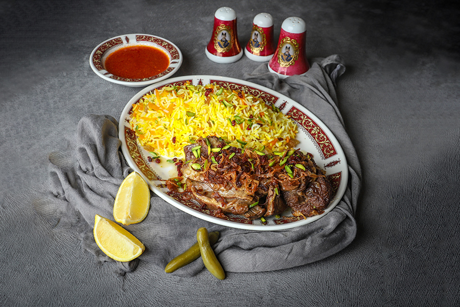 Slow Cooked Lamb (Shank or Neck), Seasoned with Special Spices, Served with Special Onion Sauce, Javaher Polo Rice